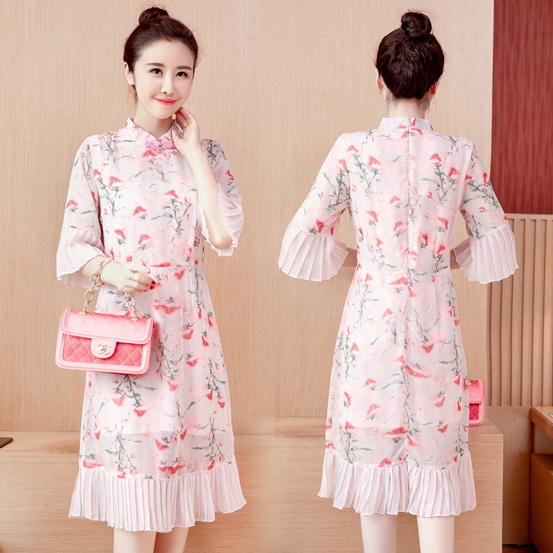dua potong Dress Lengan Panjang Model Longgar Pinggang Bahan Sifon Motif Bunga | Shopee Indonesia