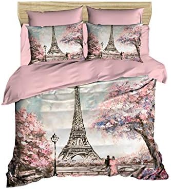 Merryword Eiffel Tower Duvet Cover Set French Style Bedding Sweet Couple Paris Tower Pink Flowers Printed Design Pink Boys Girls Bedding Sets Queen 1 Duvet Cover 2 Pillowcases (Queen, Paris Tower 3):