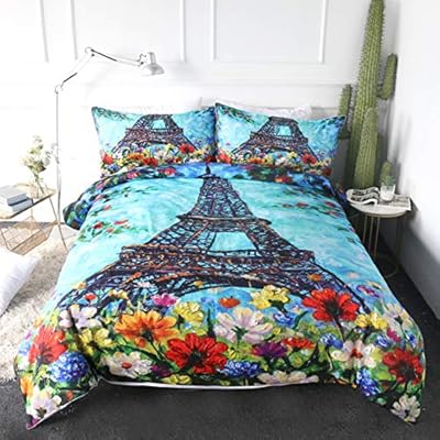 ARIGHTEX Eiffel Tower Bedding Queen 3 Piece Paris Spring Flowers Oil Painting Duvet Cover and Pillowcases Retro Blue Romantic Bedspread: Amazon.sg: Home