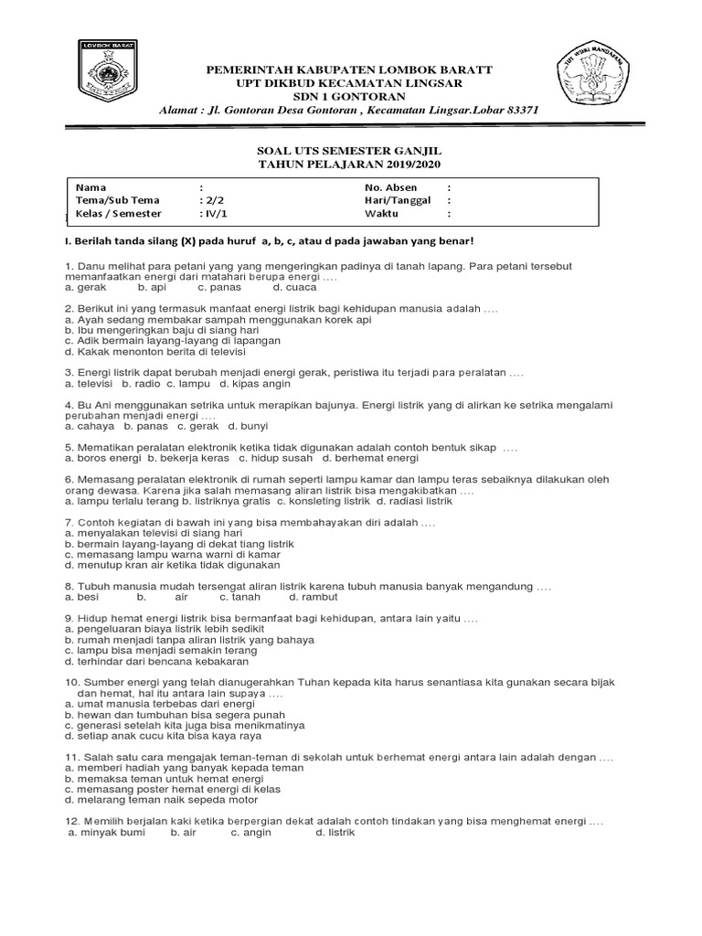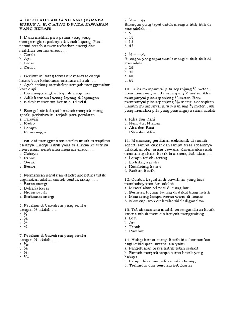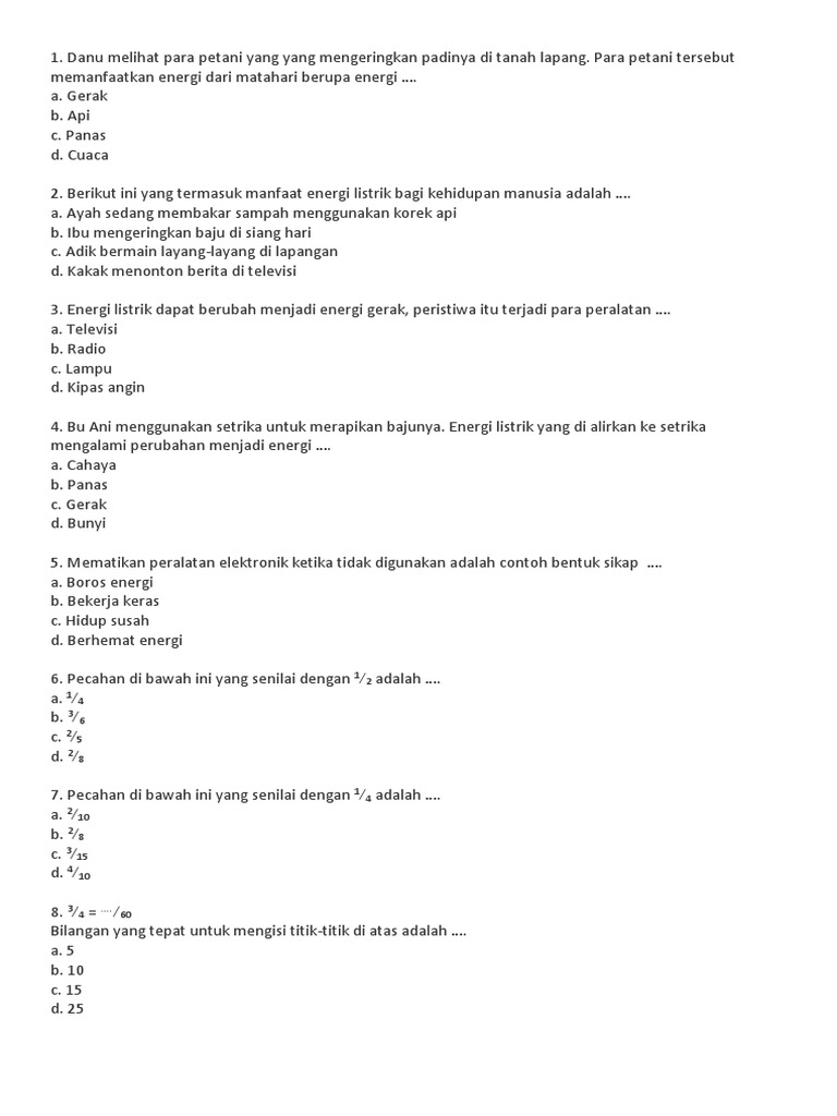 Soal Tematik Kelas 4 SD Tema 2 Subtema 2 Manfaat Energi Dan Kunci Jawaban - Www.bimbelbrilian-4