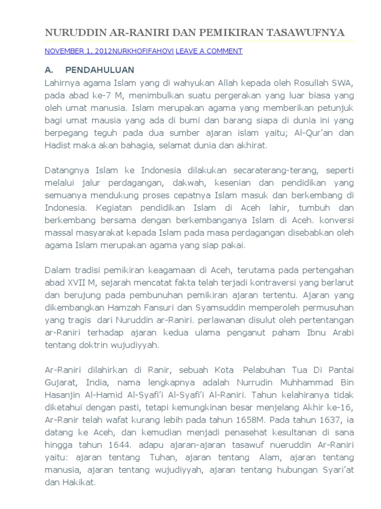PDF) PEMIKIRAN WUJUDIYAH HAMZAH FANSURI DAN KRITIK NURUDIN AL-RANIRI