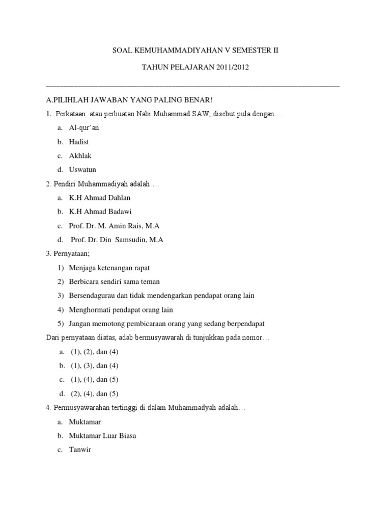 Soal Pilihan Ganda Kemuhammadiyahan Kelas Xi - Guru Ilmu Sosial