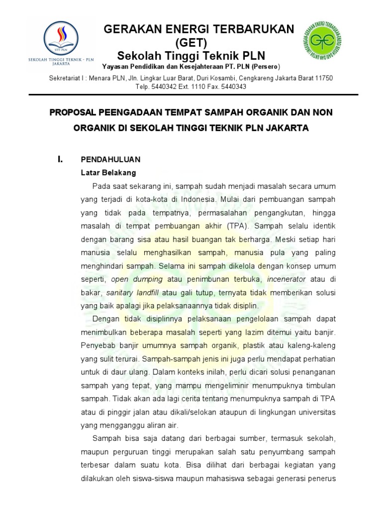 Proposal Peengadaan Tempat Sampah Organik Dan Non Organik Di Sekolah Tinggi Teknik Pln Jakarta