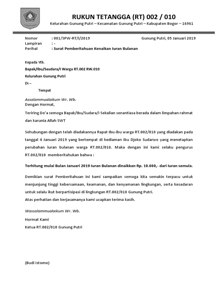 Contoh Surat Pemberitahuan Iuran Bulanan Rt Kumpulan Surat Penting - Cute766