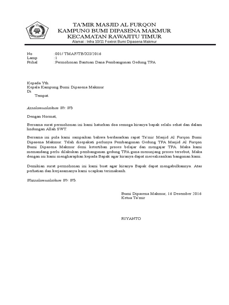 Contoh Proposal Bantuan Dana Pembangunan Masjid Doc - Bagikan Contoh
