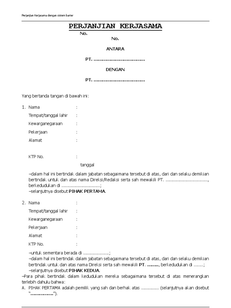 Draft Perjanjian Kerjasama Dengan Sistem Barter