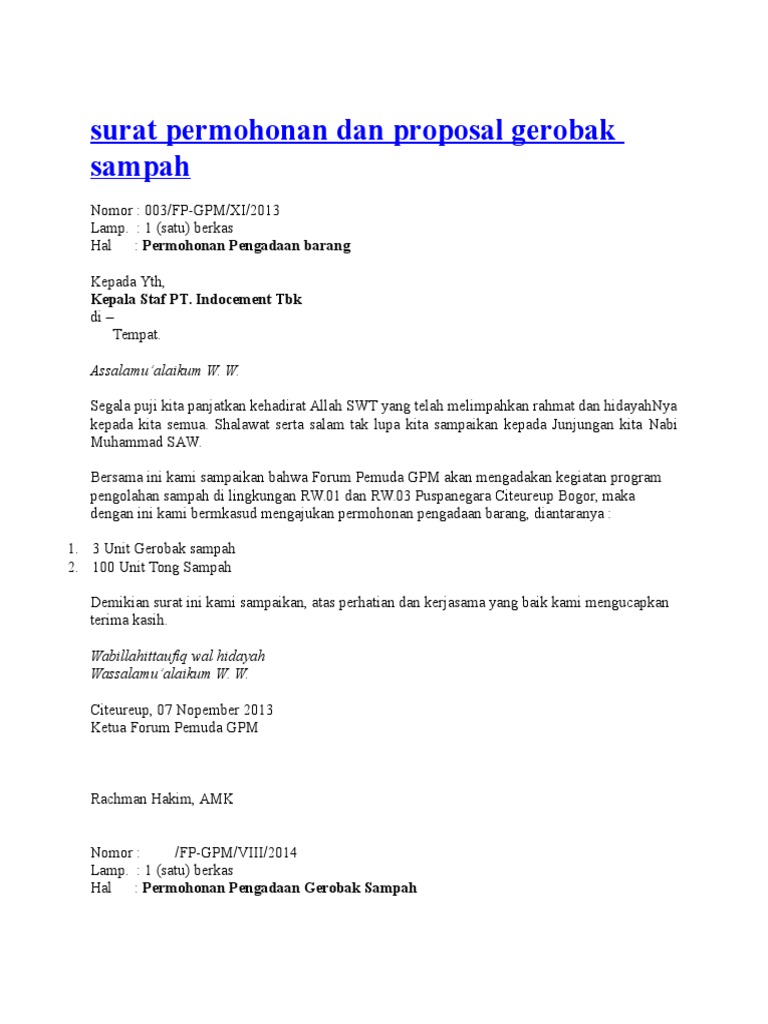 Surat Permohonan Dan Proposal Gerobak Sampah