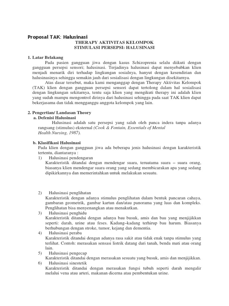 DOC) PROPOSAL TERAPI AKTIVITAS KELOMPOK (TAK) STIMULASI PERSEPSI SENSORI (HALUSINASI | supron alimudin - Academia.edu