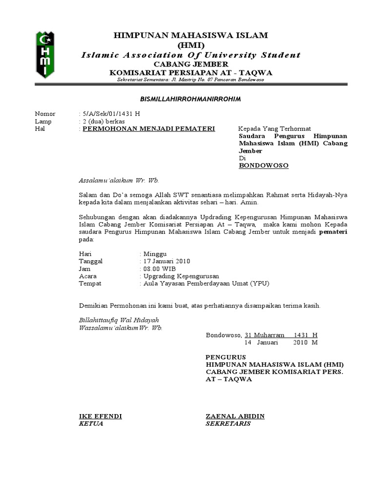 Contoh Surat Permohonan Menjadi Pemateri Seminar / Pelatihan Acara Kegiatan Himpunan Mahasiswa