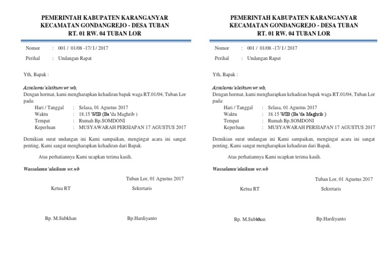 Contoh Surat Undangan Rapat Rt 17 Agustus - Sample Surat Undangan