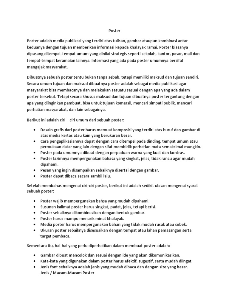 Pengertian Poster.docx - Pengertian Poster Poster merupakan salah satu media publikasi yang terdiri atas tulisan gambar ataupun kombinasi antar keduanya | Course Hero