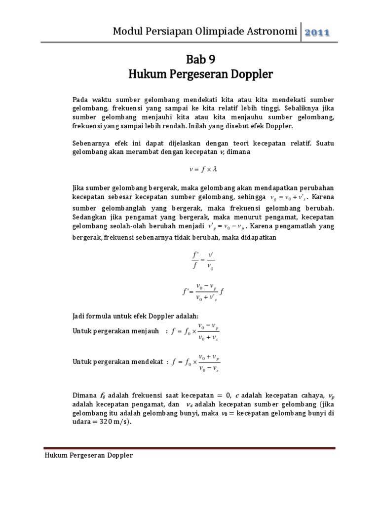 Bab Vc - Efek Efek Doppler Doppler Pada tahun 1842 Christian Doppler menunjukkan bahwa jika suatu sumber cahaya bergerak mendekati kita frekuensinya | Course Hero