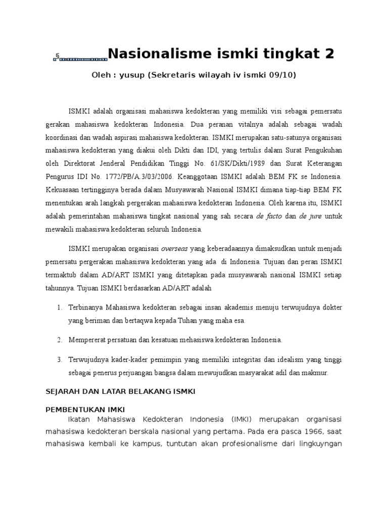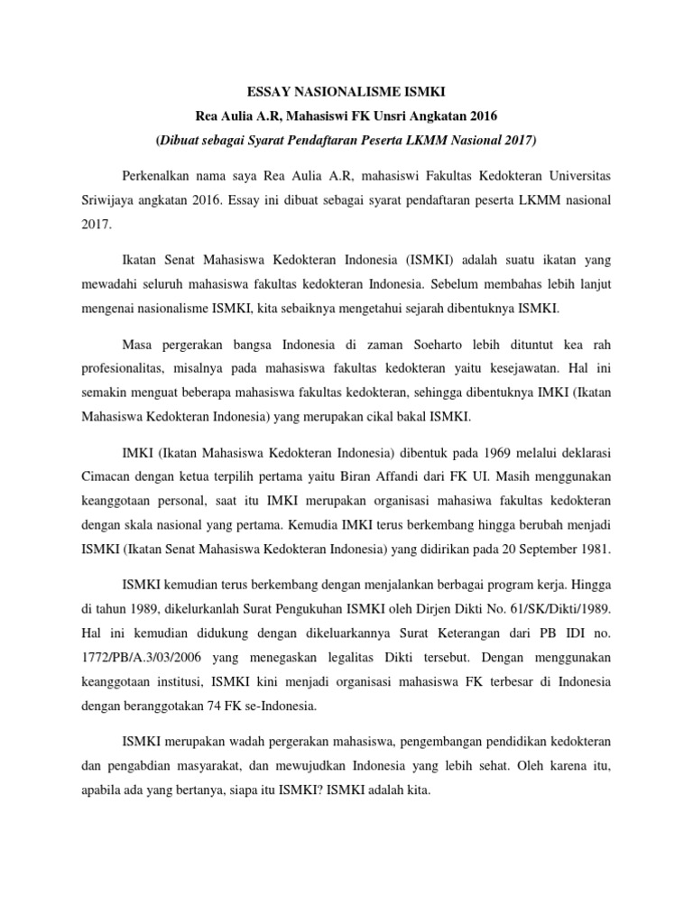 Essay Nasionalisme ISMKI Salim Aljufri ISMKI dalah organisasi yang bertindak sebagai wadah pemersatu dan pengembangan potensi pa