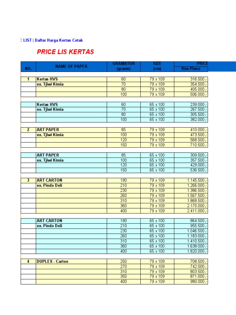 daftar harga kertas