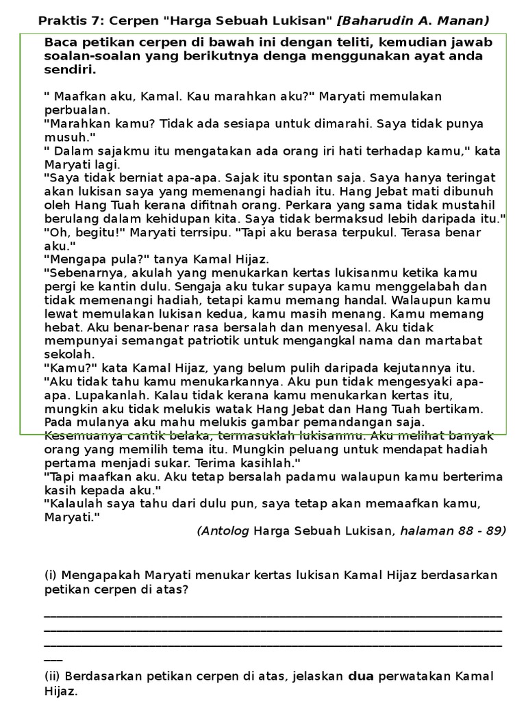 WADAH KETERAMPILAN BERBAHASA: RENCANA 116: ULASAN CERPEN HARGA SEBUAH LUKISAN