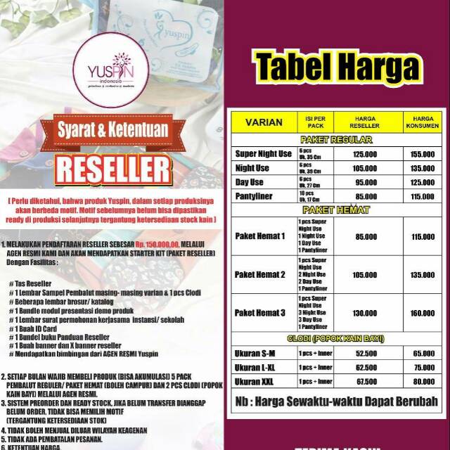 Berikut harga harga produk YUSPIN,… - Pembalut Kain Yuspin …