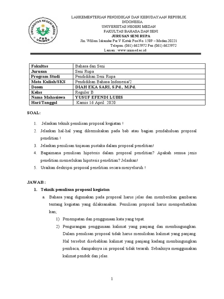 Fakultas Jurusan Program Studi Mata Kuliah/SKS Dosen Diah Eka Sari, S.Pd., M.Pd. Kelas Nama Mahasiswa Yusuf Efendi Lubis Hari/Tanggal Soal