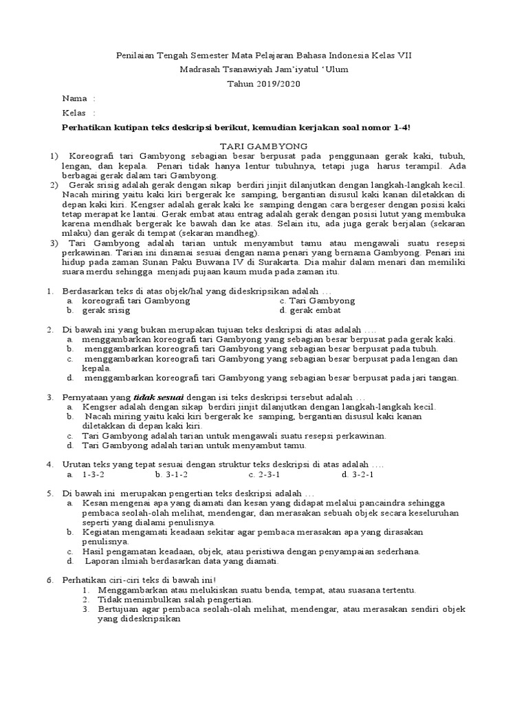 Soal Mid Bahasa Indonesia Kelas 7: Teks deskripsi tersebut berisi …