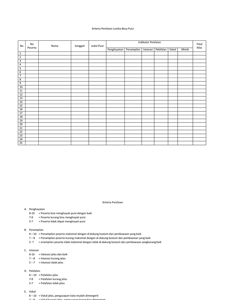 Kriteria penilaian lomba menulis puisi, membaca puisi, dan menulis …