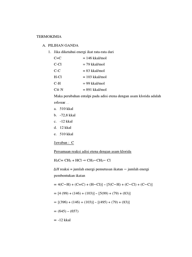 Maka Perubahan Entalpi Pada Adisi Etena Dengan Asam Klorida Menurut Persamaan Reaksi
