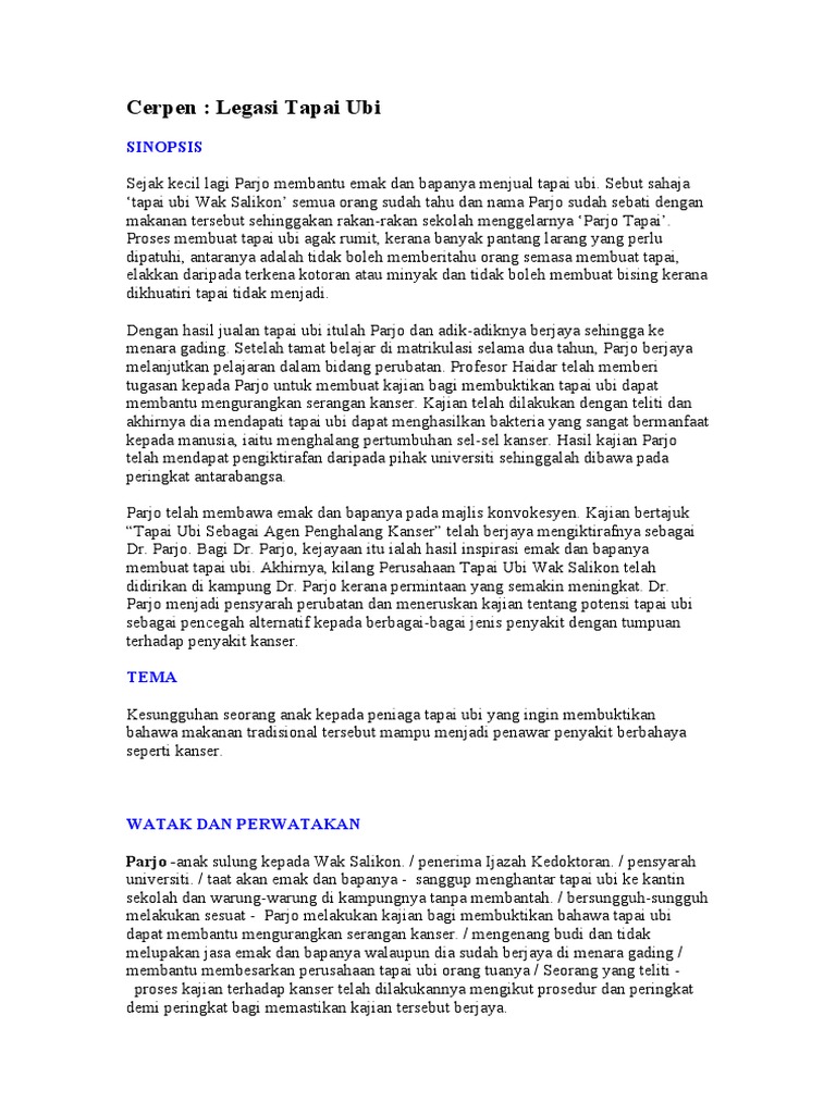 Sinopsis cerpen legasi tapai ubi