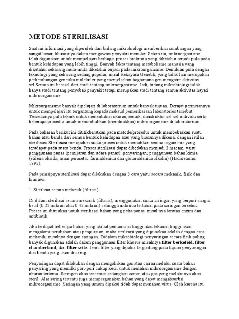 Metode Sterilisasi: chamberland, dan filter seitz. Jenis filter yang dipakai tergantung pada tujuan penyaringan