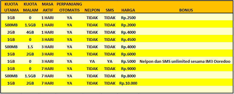 Paket Indosat IM3 Yellow 2500 1 hari 12000 7 hari Freedom Kuota Harian