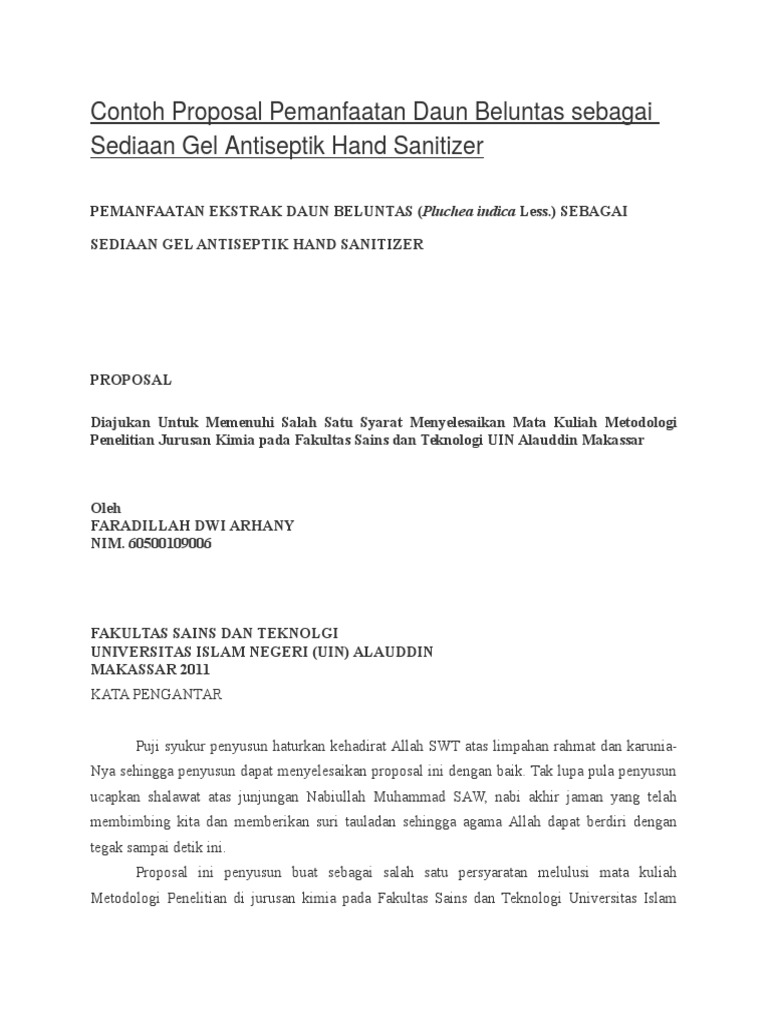 Contoh Proposal Pemanfaatan Daun Beluntas Sebagai Sediaan Gel Antiseptik Hand Sanitizer