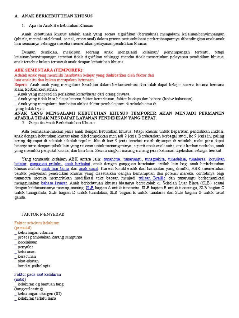 PENDAHULUAN Anak berkebutuhan khusus (ABK) adalah anak yang mempunyai kelainan/penyimpangan dari kondisi rata- rata anak normal
