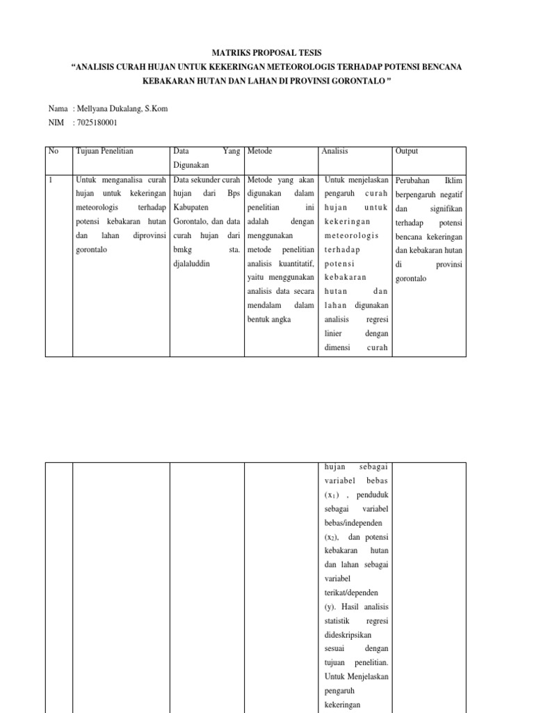 Matriks Proposal Tesis Analisis Curah Hujan Untuk Kekeringan Meteorologis Terhadap Potensi Bencana Kebakaran Hutan Dan Lahan Di Provinsi Gorontalo