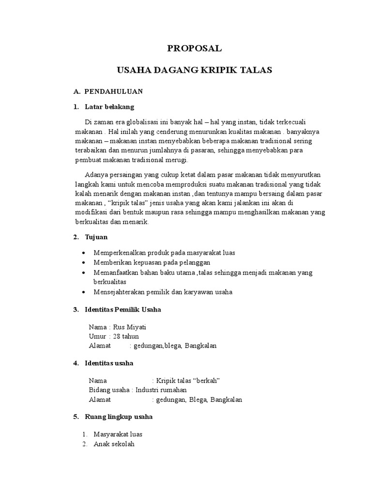 DOC) CONTOH PROPOSAL RENCANA USAHA KERIPIK TALAS PROPOSAL RENCANA …