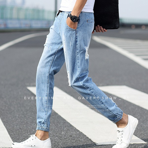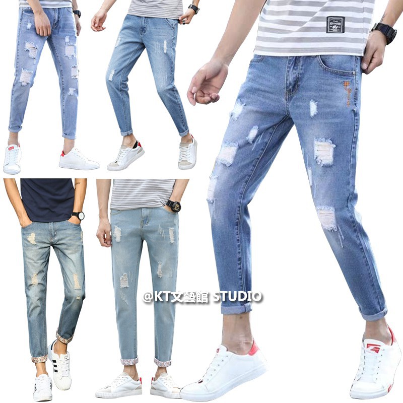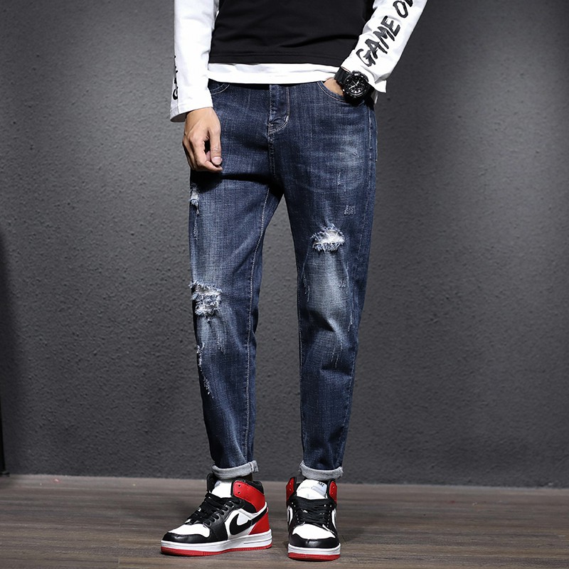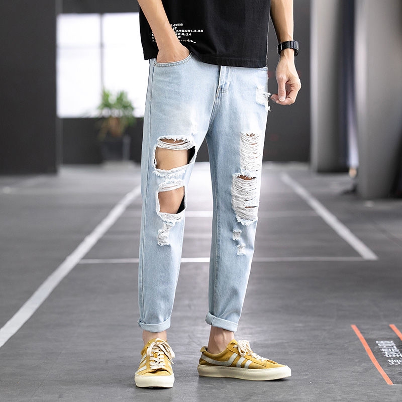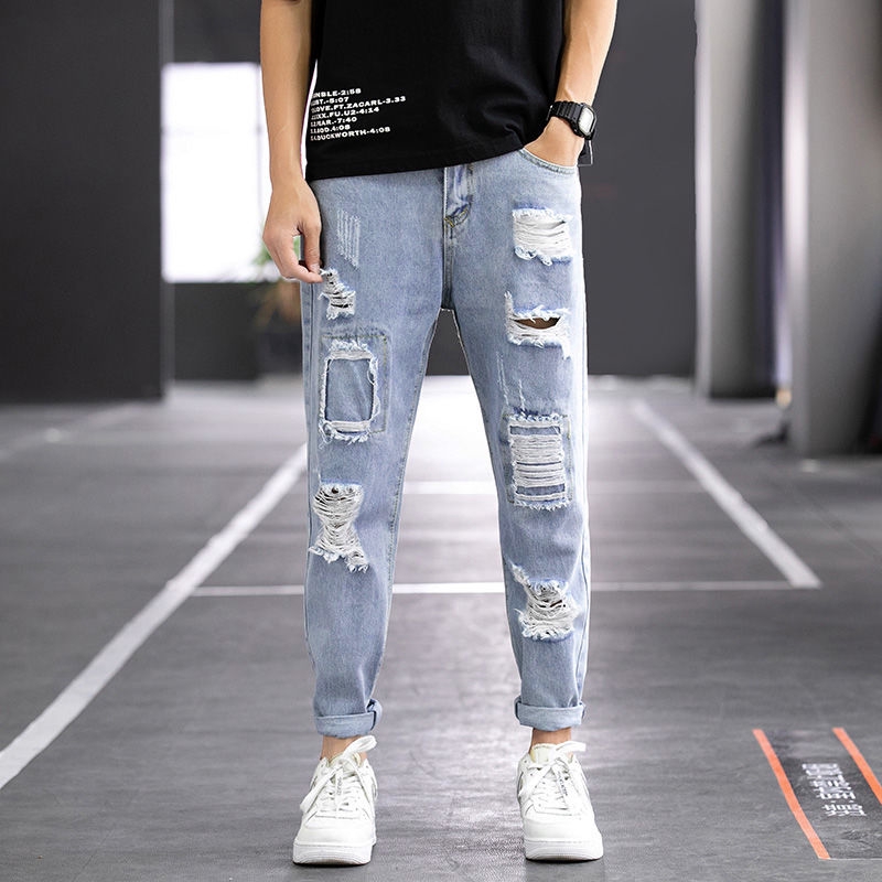 Denim Ripped Pants Jeans Male Loose Nine Points Beggars Pants Ins Zoomable Cec | Shopee Singapore