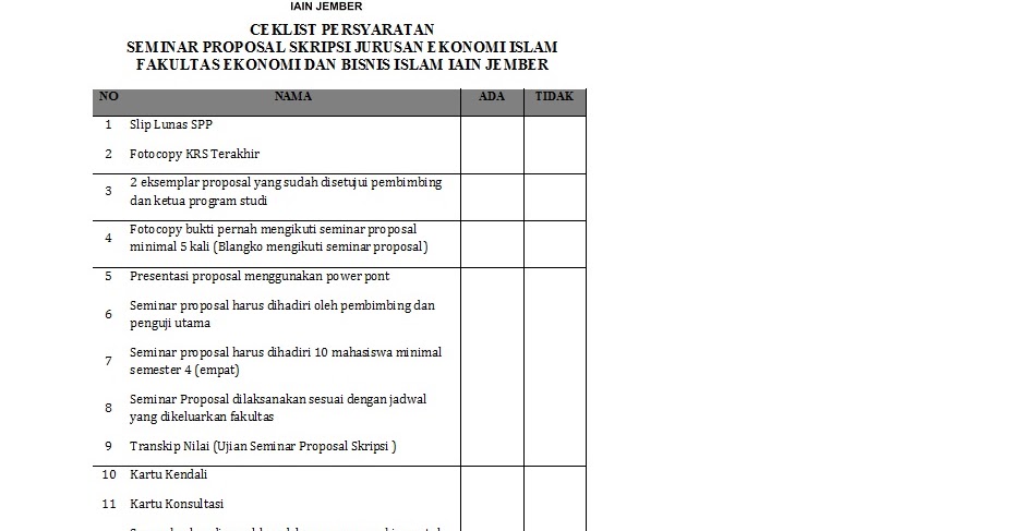 FAKULTAS EKONOMI DAN BISNIS ISLAM: CEKLIST PERSYARATAN UJIAN SEMINAR PROPOSAL SKRIPSI