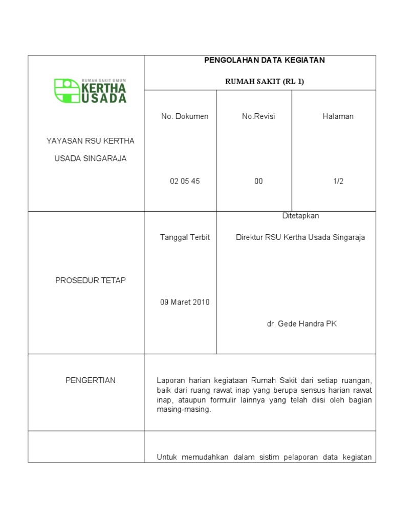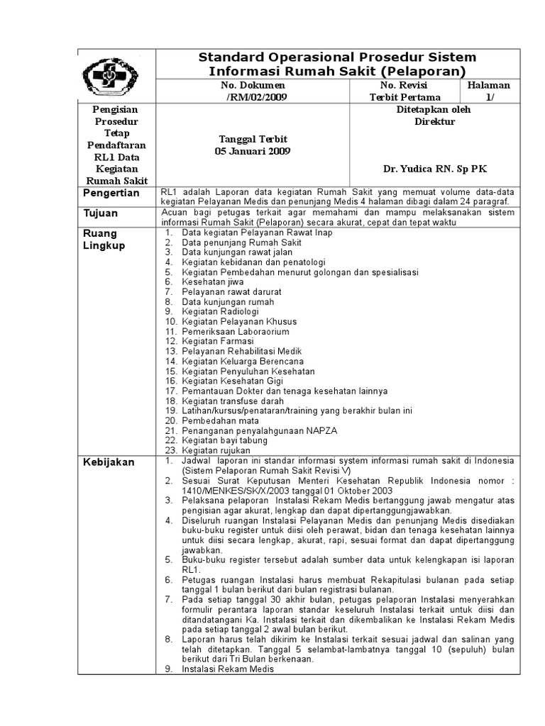 spo Pembuatan Dan Pelaporan Data Kegiatan RS (RL I)
