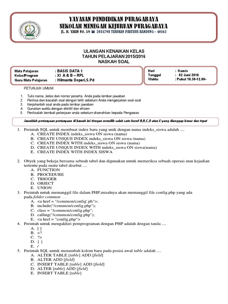 Soal uas administrasi basis data kelas 12 smk semester ganjil tahun a…