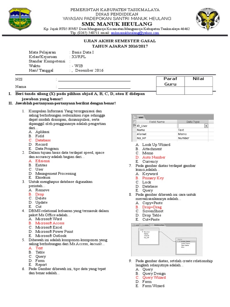 Soal uas basis data kelas 12 smk semester ganjil tahun ajaran 2015-20…