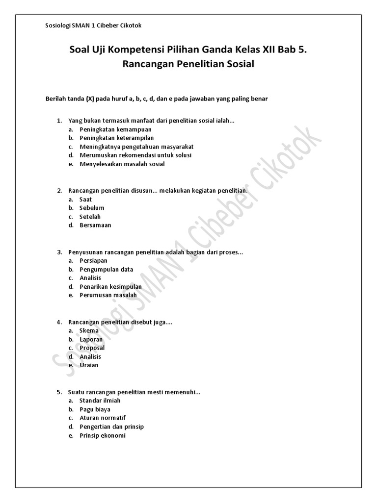 1. Soal Uji Kompetensi Pilihan Ganda Kelas XII Bab 5. Rancangan Penelitian Sosial