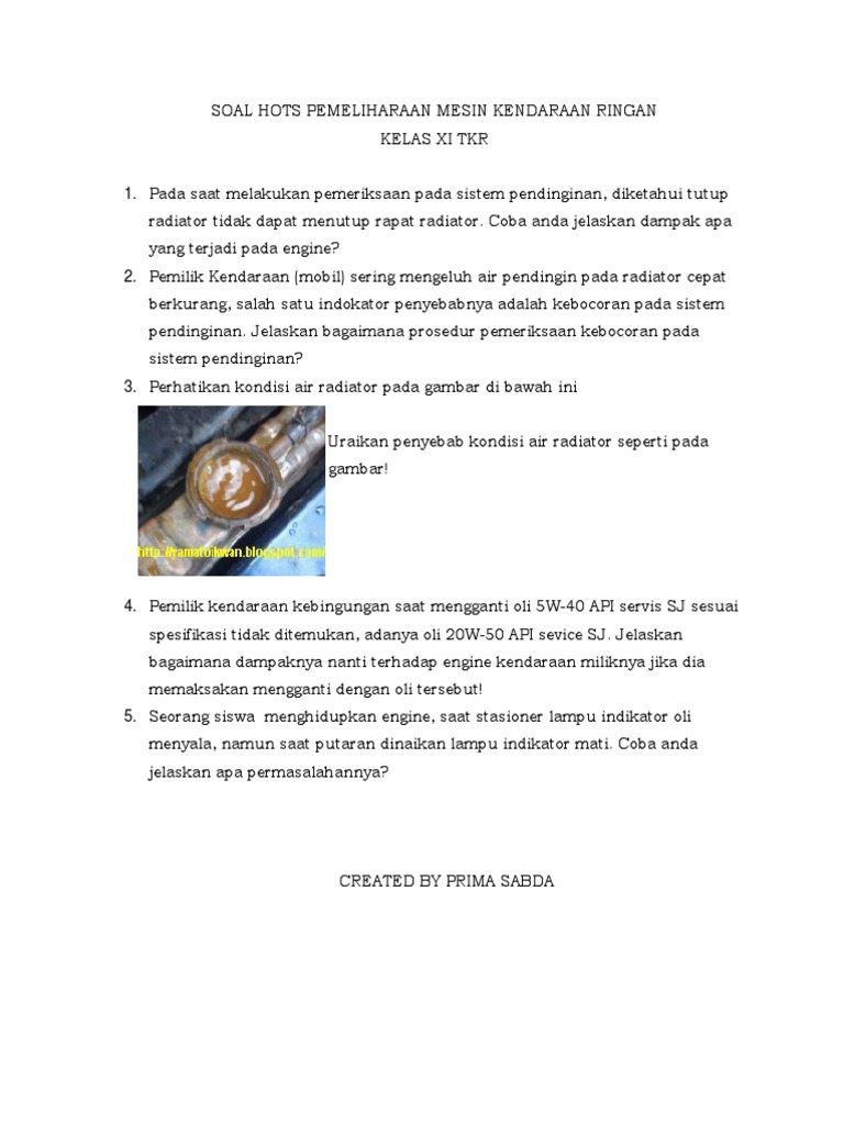 Soal Hots Pemeliharaan Mesin Kendaraan Ringan Prima