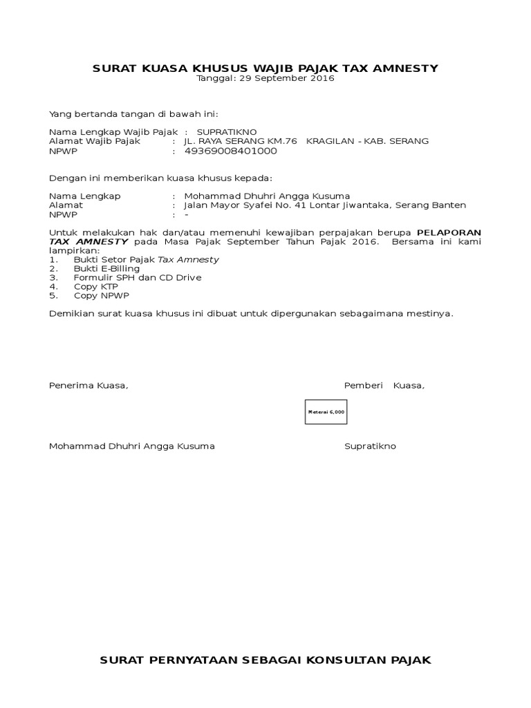 Contoh Surat Kuasa Tax Amnesty Yang Benar - Dicontoh
