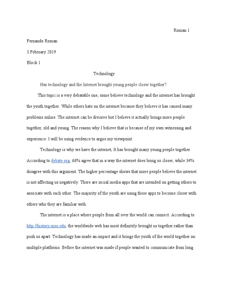 Write an argumentative essay about whether you think technology and the Internet have brought young - Brainly.com