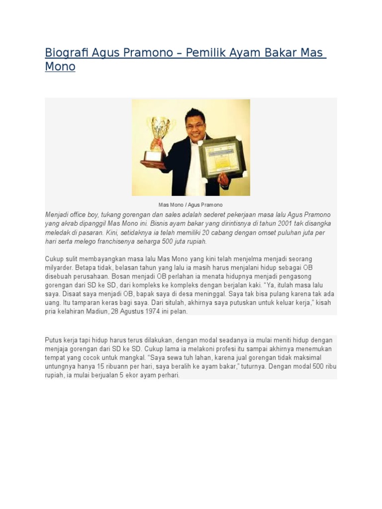 Info Biografi : Biografi Agus Pramono - pemilik waralaba Ayam Bakar Mas Mono