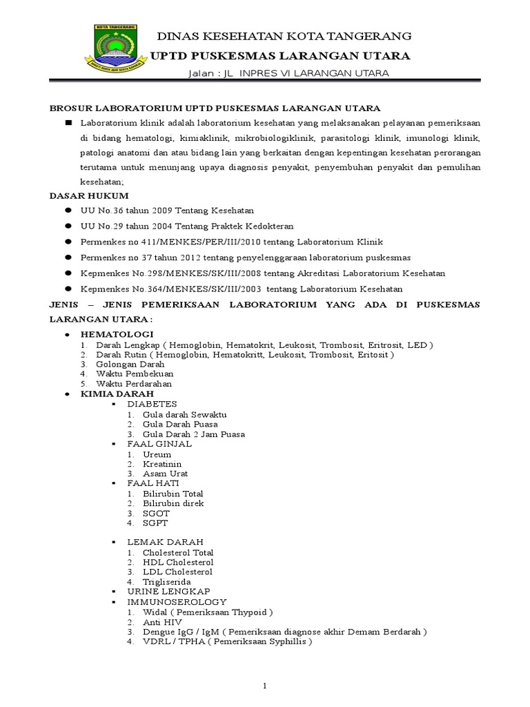 DOC) BROSUR PELAYANAN LABORAT PEMERINTAH KOTA BENGKULU DINAS KESEHATAN UPTD PUSKESMAS PERAWATAN RATU AGUNG | wahyu ningsih - Academia.edu