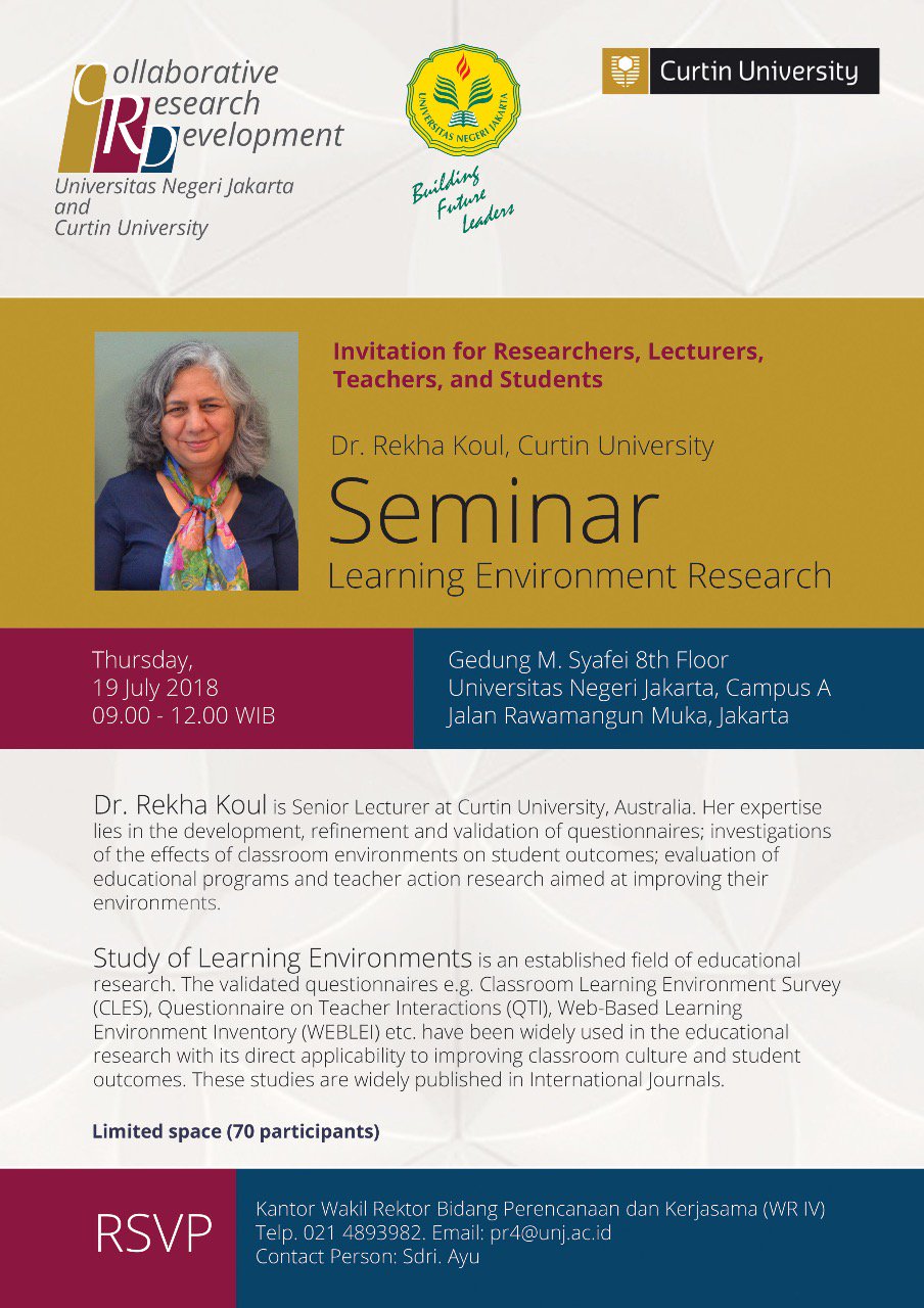 UNIV. NEGERI JAKARTA: “Seminar Learning Environment Research bersama Dr. Rekha Koul, Senior Lecture at Curtin University, kolaborasi antara UNJ dengan Curtin University. Kegiatan ini diikuti oleh mahasiswa, guru, dosen dan peneliti,