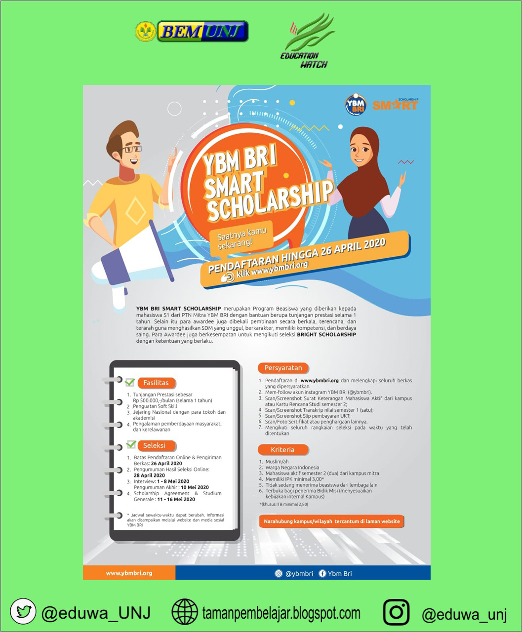 Education Watch UNJ on Twitter: " EDUWA INFO Haloo Sobat EDUWA. Ada info beasiswa nih untuk kamu Mahasiswa/i semester 2. [ Seleksi Nasional YBM BRI Smart Scholarship ] Kanwil Jakarta 1