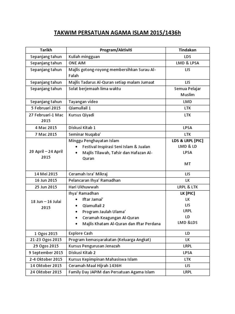Takwim Persatuan Agama Islam 2015/1436H: Tarikh Program/Aktiviti Tindakan