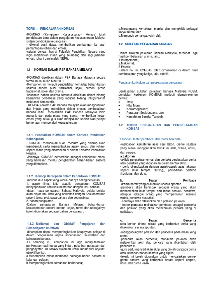 Topik 1 Pengajaran Komsas: 1.1 Komsas Dalam P&P Bahasa Melayu