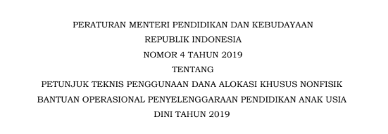 Permendikbud Nomor 4 Tahun 2019 tentang Juknis BOS PAUD Tahun 2019 (Penggunaan Dana Alokasi Khusus Non Fisik)