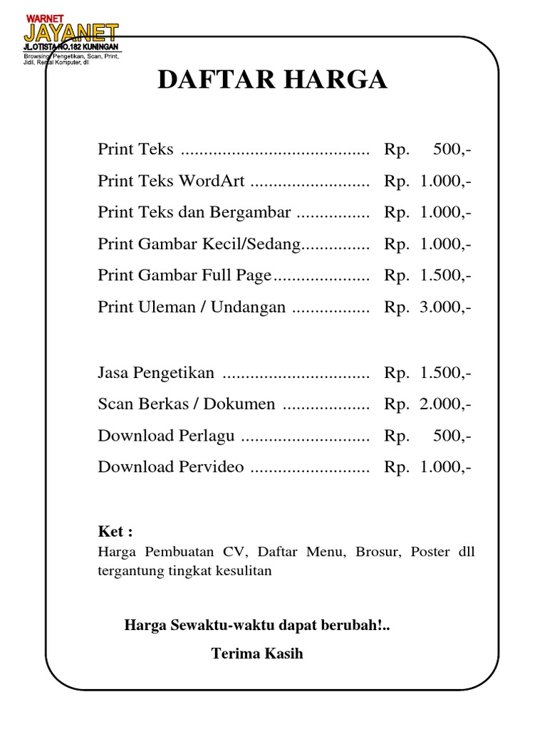 Daftar Harga Cetak