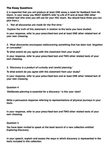 Example ‘Discovery’ essay questions HSC Standard English | Teaching Resources