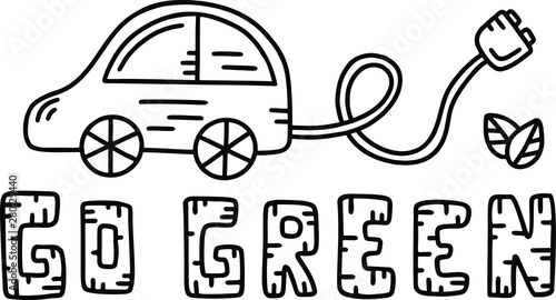 Monochrome Doodle of Go green lettering with electric car. Vector illustration for poster, card, board. Cartoon hand drawing - Buy this stock vector and explore similar vectors at Adobe Stock | Adobe Stock